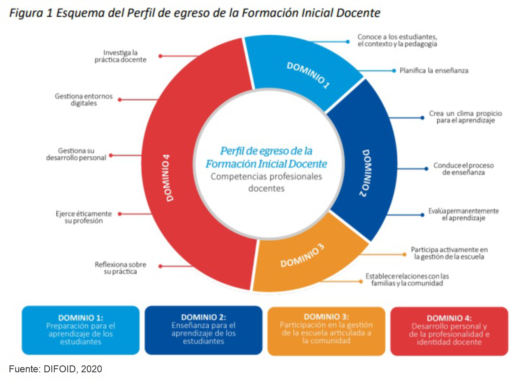 El Perfil de egreso incorpora competencias vinculadas a la formación integral que requieren los docentes en el siglo XXI. Estas son de naturaleza transversal a las competencias profesionales docentes presentadas en el MBDD. Son esenciales para la construcción de la profesionalidad e identidad docente en la Formación Inicial Docente. Para efectos de organización y coherencia del Perfil de egreso, estas se incluyen en el dominio 4 establecido en el MBDD, al que se le ha agregado el término personal. Tales competencias se orientan al fortalecimiento del desarrollo personal, a la gestión de entornos digitales y al manejo de habilidades investigativas que le permitan reflexionar y tomar decisiones para mejorar su práctica pedagógica con base en evidencias.