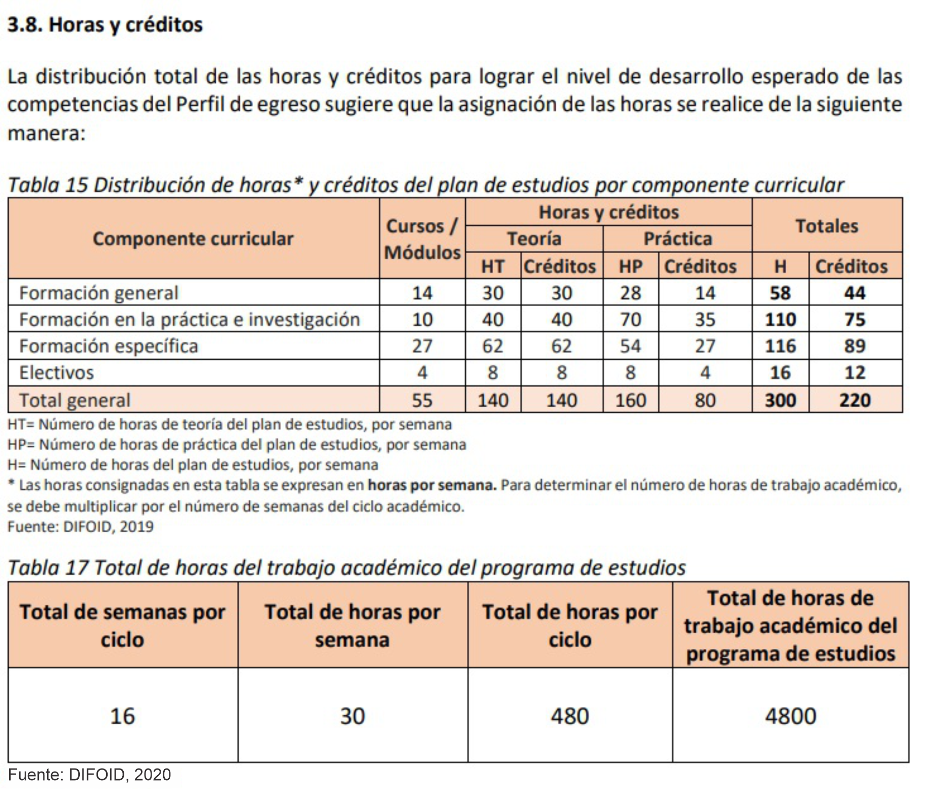 El plan de estudios tiene diez (10) ciclos académicos con un total de 220 créditos. Cada ciclo se desarrolla en dieciséis (16) semanas, treinta (30) horas semanales, cuatrocientas ochenta (480) horas por ciclo y cuatro mil ochocientas horas de trabajo académico (4800) en toda la trayectoria formativa.