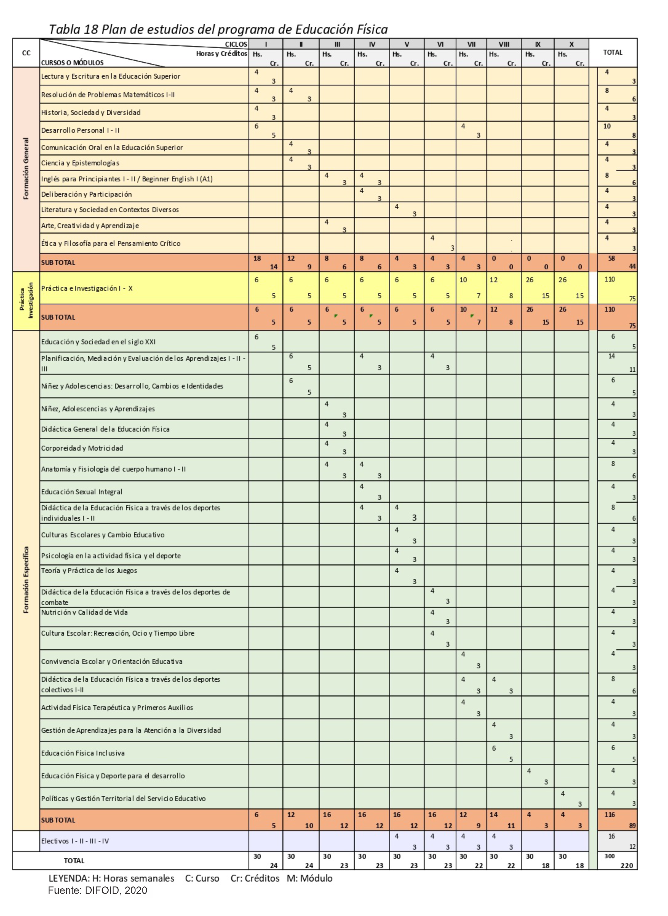 El plan de estudios presenta la organización de los cursos y módulos en cada uno de los componentes curriculares. También se detalla información sobre la naturaleza del mismo, en términos de curso (C) o módulo (M), lo cual garantiza el logro de los resultados previstos en las competencias. Por último, ubica el curso o módulo en cada ciclo, señalando sus horas (teoría/práctica) y créditos.